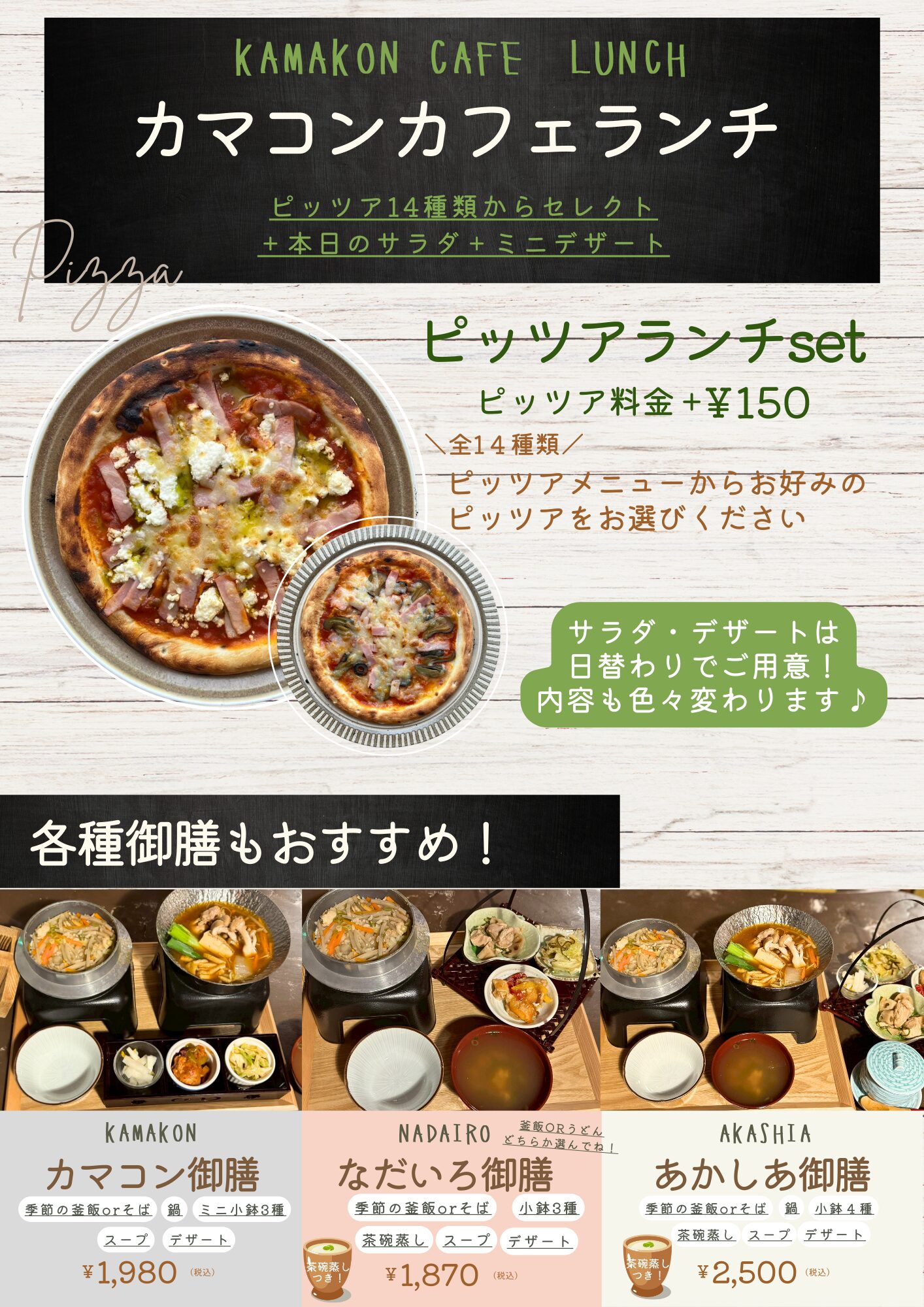 2025年12月~のランチメニューです。釜飯には、冬の海の味覚「ホタテ」を使用し、寒い季節にぴったりのあったかお鍋と、鴨の出汁がしみこんだお蕎麦をご用意。定番のマルゲリータはもちろん、五穀米入りの出汁ご飯もおすすめです。